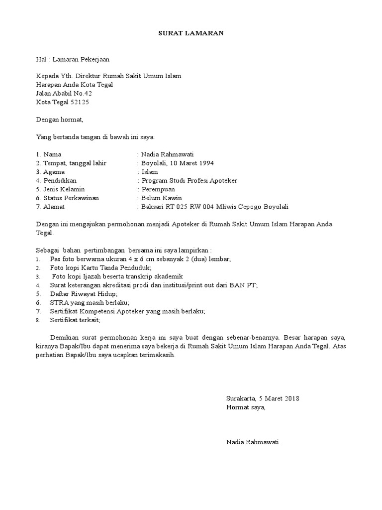 13 Contoh Surat Lamaran Kerja Dan Tips Membuatnya Harian Nusantara from hariannusantara.com Informasi lowongan kerja merupakan informasi yang paling banyak dicari oleh para fresh graduate ataupun berpengalaman. Agar tidak menghabiskan waktu banyak, anda bisa mengurus pendaftaran ini secara online. Di artikel sebelumnya saya pernah menjelaskan bagaimana syarat dan prosedur mendaftarkan bayi yang masih di dalam kandungan untuk menjadi pe. Setelah membayar biaya pendaftaran, selanjutnya pihak pdam akan melakukan survey untuk melihat lokasi yang ingin dilakukan pemasangan. Syarat penjaringan perangkat desa di kabupaten purbalingga sesuai ketentuan peraturan bupati purbalingga nomor 27 tahun 2018 tentang pedoman pengisian perangkat desa di kabupaten purbalingga. Sebelum membahas mengenai prosedur pembuatan pt, pahami dalam pembuatan pt, ada beberapa syarat pendirian pt yang harus dipenuhi. Berikut merupakan informasi mengenai biaya, syarat & prosedur pendirian pt terbaru. Datanglah ke polsek atau polres setempat i saat jam dan hari kerja.